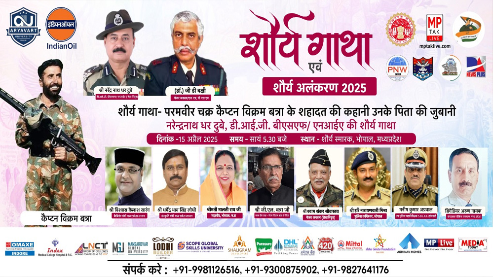 भारतीय सैन्य शौर्य, बलिदान और देशभक्ति की गाथाओं को जनमानस तक पहुँचाने के उद्देश्य से आयोजित होने जा रहा है एक गौरवशाली आयोजन "शौर्य गाथा एवं शौर्य अलंकरण- 2025", जो दिनांक 15 अप्रैल 2025 को शौर्य स्मारक, भोपाल (म.प्र.) में आयोजित किया जाएगा। यह कार्यक्रम सायं 5:30 बजे प्रारंभ होगा।