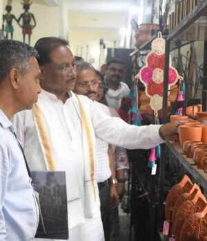 मुख्यमंत्री विष्णु देव साय ने आज शिल्पनगरी कोण्डागांव के आगमन पर शबरी एंपोरियम का भ्रमण किया। इस दौरान उन्होंने बेलमेटल, रॉट आयरन, बांस एवं काष्ठ शिल्प के बस्तर की जीवन शैली और समृद्ध जनजातीय संस्कृतियों को दर्शाती कलाकृतियों को देखा और इसकी सराहना की। उन्होंने यहां शिल्पियों से मुलाकात कर बेलमेटल सहित विभिन्न कलाकृतियों की निर्माण प्रक्रिया और उनकी मार्केटिंग के संबंध में जानकारी ली। शिल्पकारों ने मुख्यमंत्री को बेलमेटल से बने कलाकृति भेंट की।