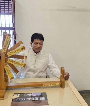 विधायक गोपालसिंह इंजीनियर ने साबरमती आश्रम में चरखा चलाया,आश्रम में स्थापित महात्मा गांधी की प्रतिमा पर सूत की माला पहना कर बापू को नमन किया ।