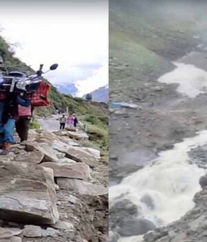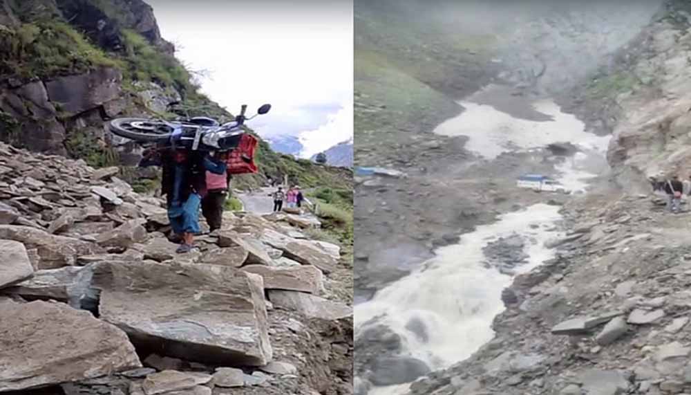 भूस्खलन से सड़क बंद हुई तो युवक ने कंधे पर उठाकर दूसरी तरफ पहुंचाई बाइक