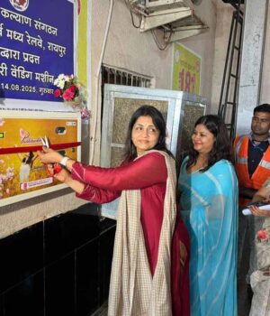 यात्रियों की सुविधा के लिए रेलवे स्टेशन में सैनेटरी नैपकिन का मशीन लगाया है. इस मशीन से महिलाएं मात्र 5 रुपए में पैड ले सकती है. 2nd क्लास वेटिंग हॉल में पास लगाएं गए इस मशीन का उद्घाटन आज अध्यक्षा सेक्रो शिखा सिंह द्वारा की गया, उनके साथ सेक्रो की अन्य पदाधिकारी भी मौजूद थें.