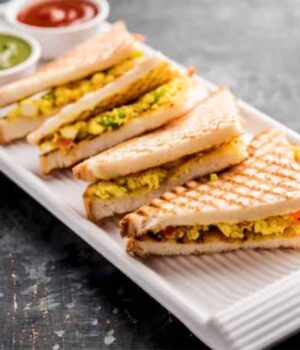 सैंडविच की एक स्लाइस पर तैयार पनीर भुर्जी की स्टफिंग रखें और दूसरी स्लाइस से ढक दें।