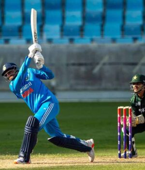 हारून जॉर्ज की क्लासिक बैटिंग! नंबर-3 पर बैटिंग करने आए हारून जॉर्ज क्लासिक बल्लेबाजी कर रहे हैं। बेहतरीन टाइमिंग के साथ शॉट्स लगा रहे हैं। वह अभी तक 6 चौकों की मदद से 27 के निजी स्कोर पर पहुंच गए हैं। वहीं आयुष म्हात्रे 38 रन बनाकर खेल रहे हैं। आयुष म्हात्रे रुकने का नाम नहीं ले रहे हैं। 6ठे ओवर की आखिरी गेंद पर उन्होंने सामने की तरफ शानदार छक्का लगाकर भारत के स्कोर को 50 के पार पहुंचाया। भारतीय कप्तान 21 गेंदों पर 37 के निजी स्कोर पर पहुंच गए हैं।