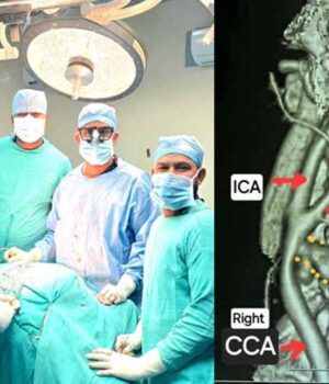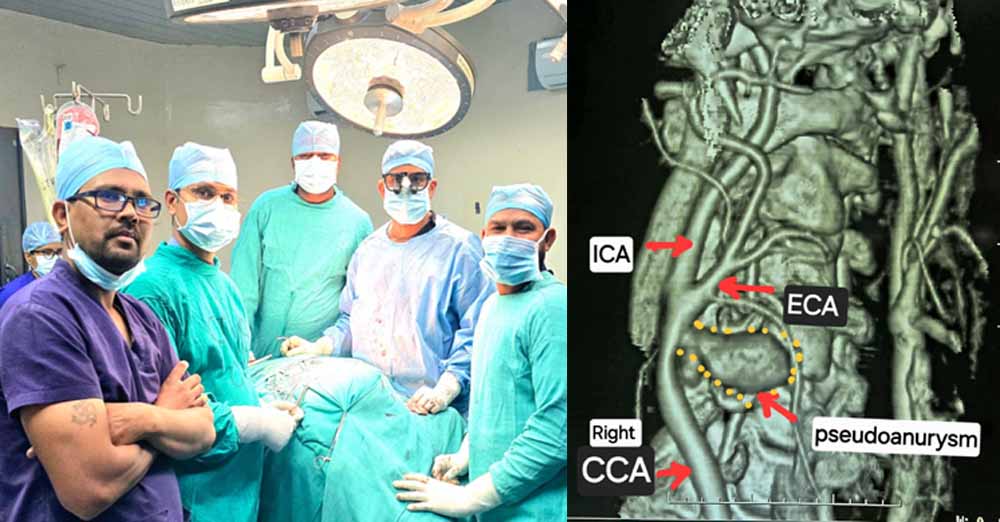 गर्दन के नसों की सीटी एंजियोग्राफी जांच में यह चौंकाने वाला तथ्य सामने आया कि मरीज की दायीं कैरोटिड आर्टरी फट चुकी है और उसके चारों ओर गुब्बारानुमा संरचना बन गई है, जिसे कैरोटिड आर्टरी स्यूडोएन्युरिज्म (Carotid Artery Pseudoaneurysm) कहा जाता है। स्थिति की गंभीरता को देखते हुए मरीज को तत्काल हार्ट, चेस्ट एवं वैस्कुलर सर्जरी विभाग में में डॉ कृष्ण कांत साहू के पास भेजा गया।
