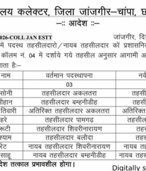 जारी आदेश के अनुसार शशिभूषण सोनी को तहसीलदार अकालतरा से तहसीलदार बम्हनीडीह, अविनाश चौहान को तहसीलदार बम्हनीडीह से तहसीलदार अकालतरा, मती शालिनी तिवारी को अतिरिक्त तहसीलदार अकालतरा से अतिरिक्त तहसीलदार नवागढ़, महेंद्र लहरे को तहसीलदार पामगढ़ से तहसीलदार शिवरीनारायण, टिकेन्द्र नुरूटी को तहसीलदार शिवरीनारायण से तहसीलदार बलौदा, अमरनाथ श्याम को तहसीलदार बलौदा से तहसीलदार पामगढ़, संजय बरेठ को नायब तहसीलदार शिवरीनारायण से तहसीलदार बम्हनीडीह एवं चंद्रकुमार साहू नायब को तहसीलदार बहनीडीह से नायब तहसीलदार शिवरीनारायण पर पदस्थ किया है।