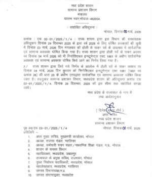 पूर्व में 29 दिसंबर 2025 की अधिसूचना के अनुसार केवल 3 मार्च 2026 (मंगलवार) को होली का अवकाश घोषित था। अब इसे संशोधित कर 4 मार्च 2026 (बुधवार) को भी छुट्टी का दिन तय किया गया है। यह अवकाश 'निगोशिएबल इन्स्ट्रूमेन्ट्स एक्ट 1881' की धारा 25 के अंतर्गत घोषित किया गया है, जिसका अर्थ है कि यह सार्वजनिक और सामान्य अवकाश की श्रेणी में आएगा। यह संशोधित अधिसूचना मध्य प्रदेश के राज्यपाल के नाम से और आदेशानुसार सामान्य प्रशासन विभाग के अपर सचिव दिनेश कुमार मौर्य द्वारा 1 मार्च 2026 को जारी की गई है